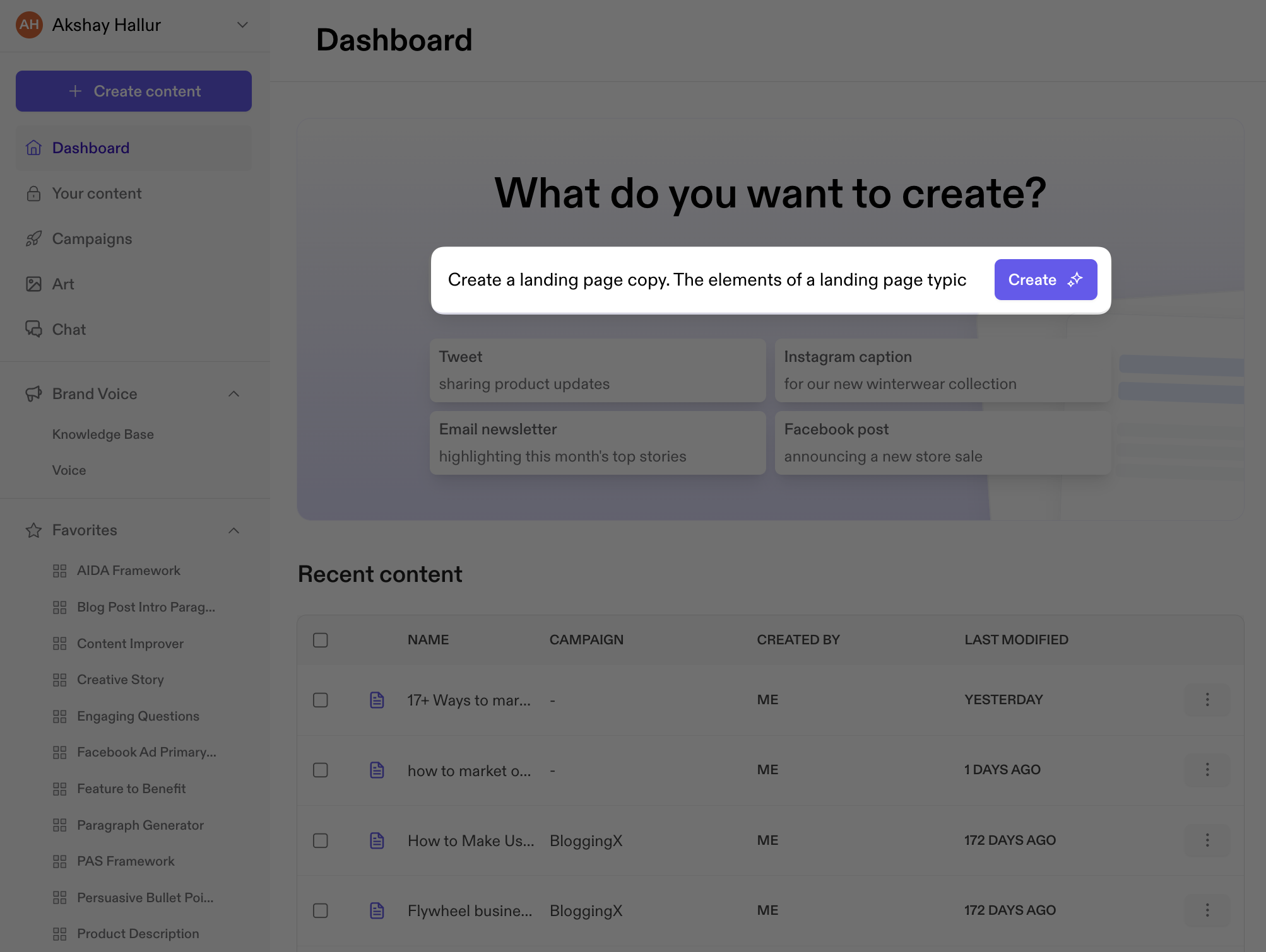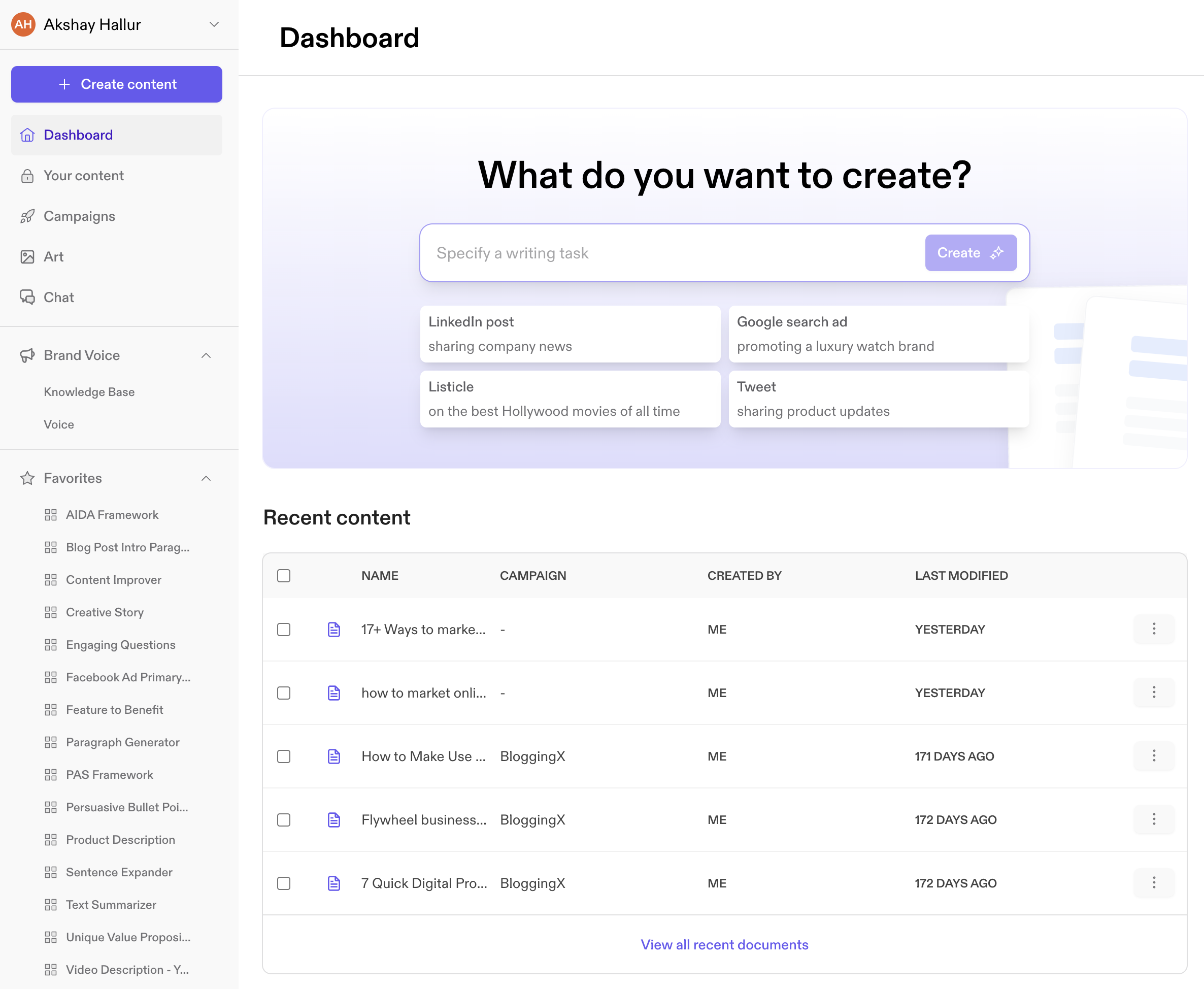 - Easy to create on brand content: With Jasper, you can create branded content by loading your company’s information. Additionally, the brand voice feature allows you to train the AI model to mimic your writing style.