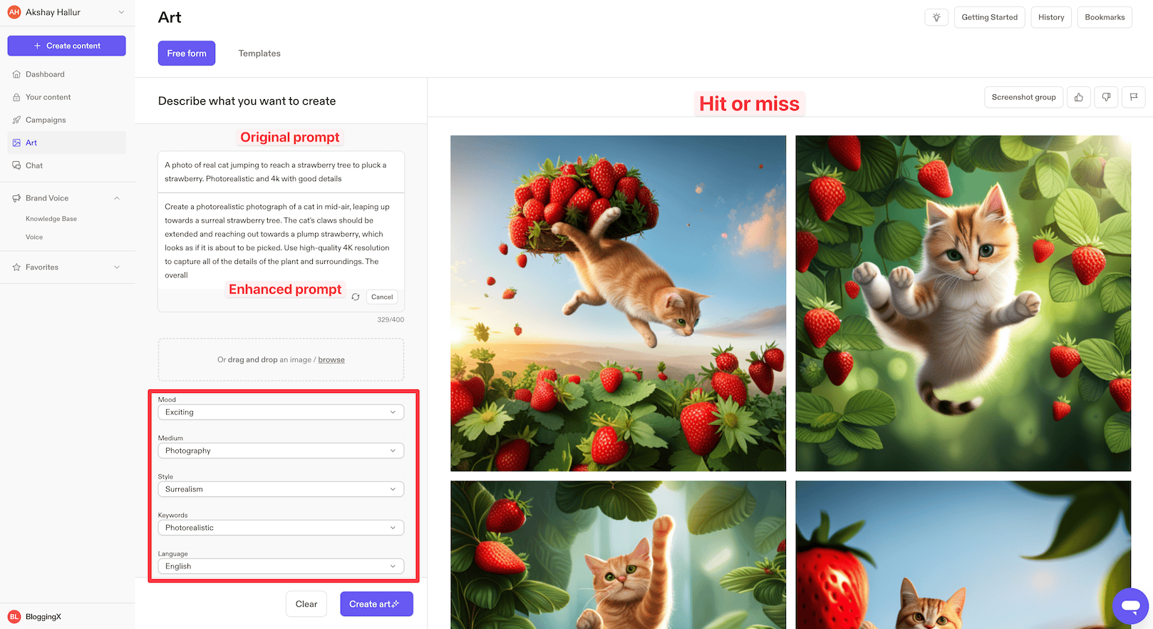 To start, you need to provide a prompt and also give creative inputs like style, mood, and keywords for better results.