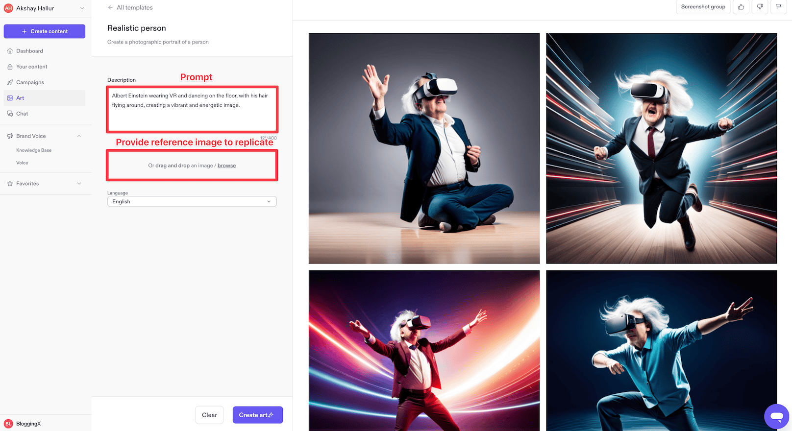For example, I have selected realistic person here, and provided it a prompt to create an image that shows Albert Einstein wearing VR and dancing.