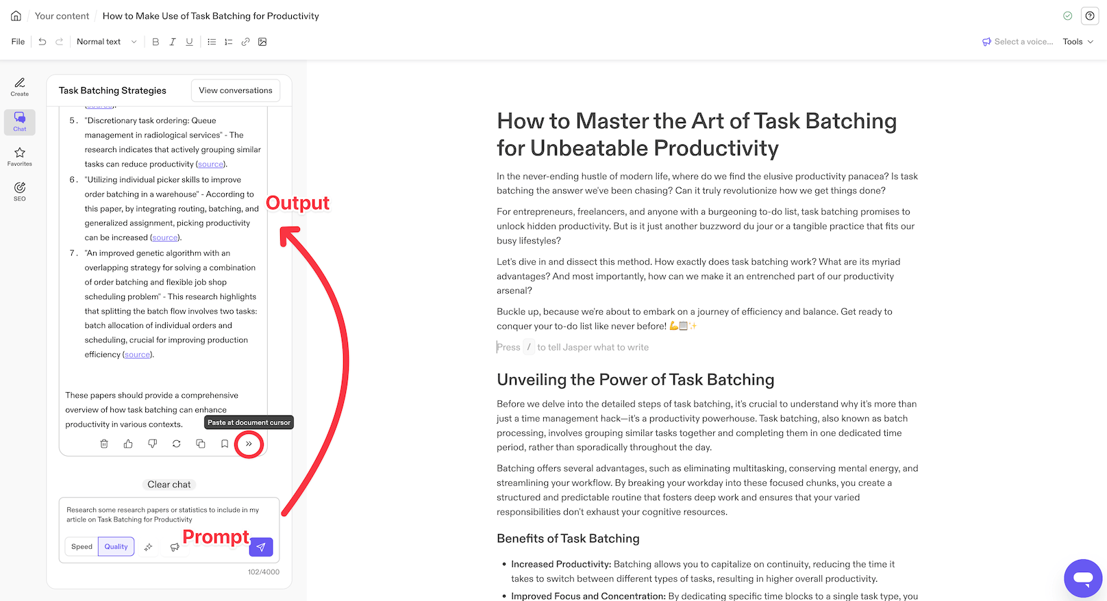 The best part is that if you specialize in copywriting or writing SEO content, Jasper is already fine-tuned for long-form and copywriting content, allowing you to generate high-quality web content without the need for extensive prompting like with ChatGPT.