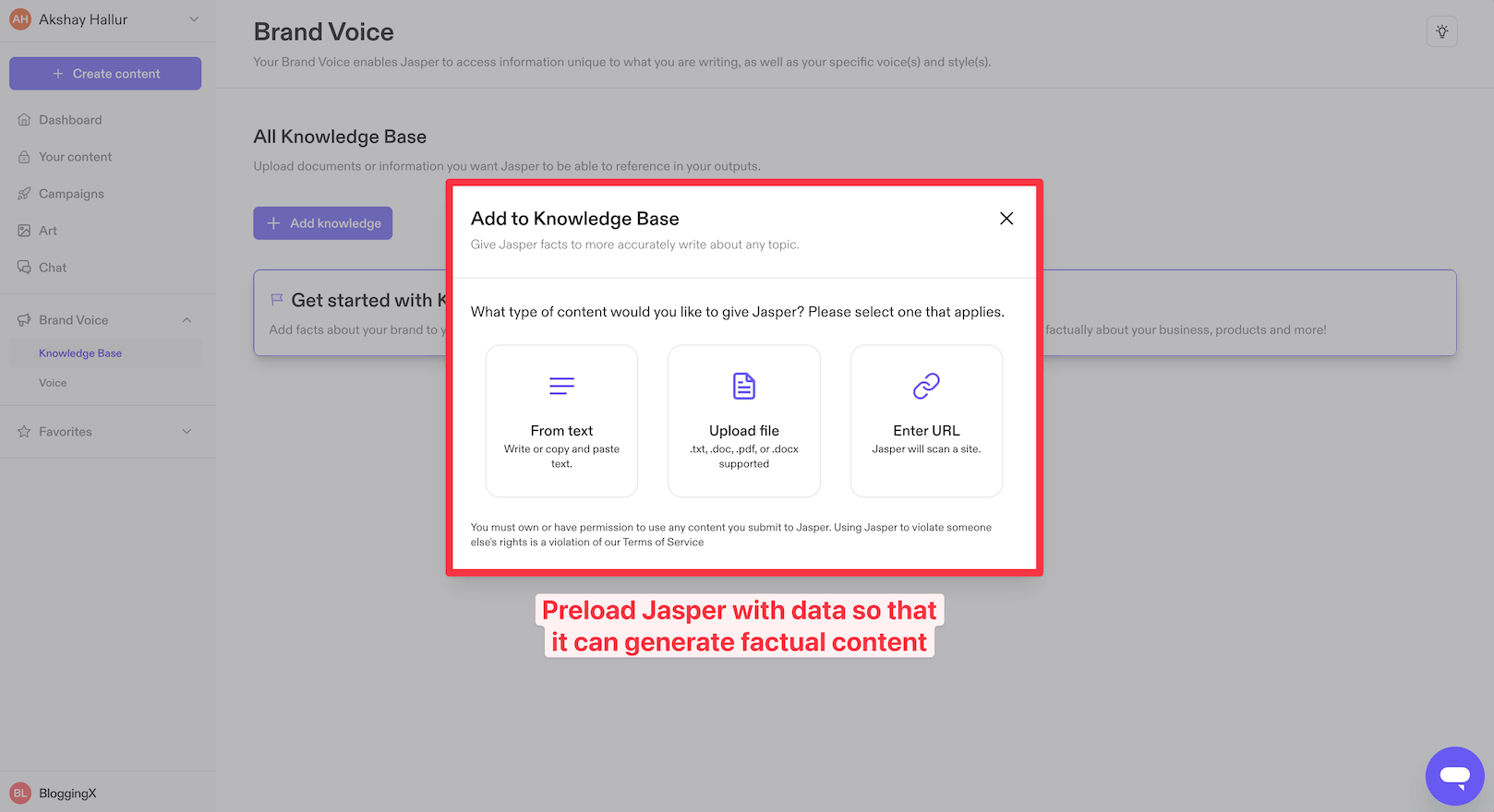 Knowledge allows you to provide Jasper with facts or data it needs to remember.