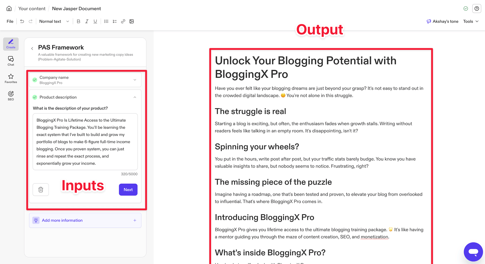 This means that whenever Jasper creates content, it will align with my ideal tone of voice for generating content.
