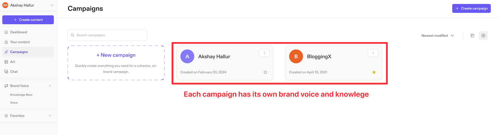 Unlike folders, each campaign allows you to add a description, a specific tone of voice, and associate it with knowledge that you may have fine-tuned with your AI web.