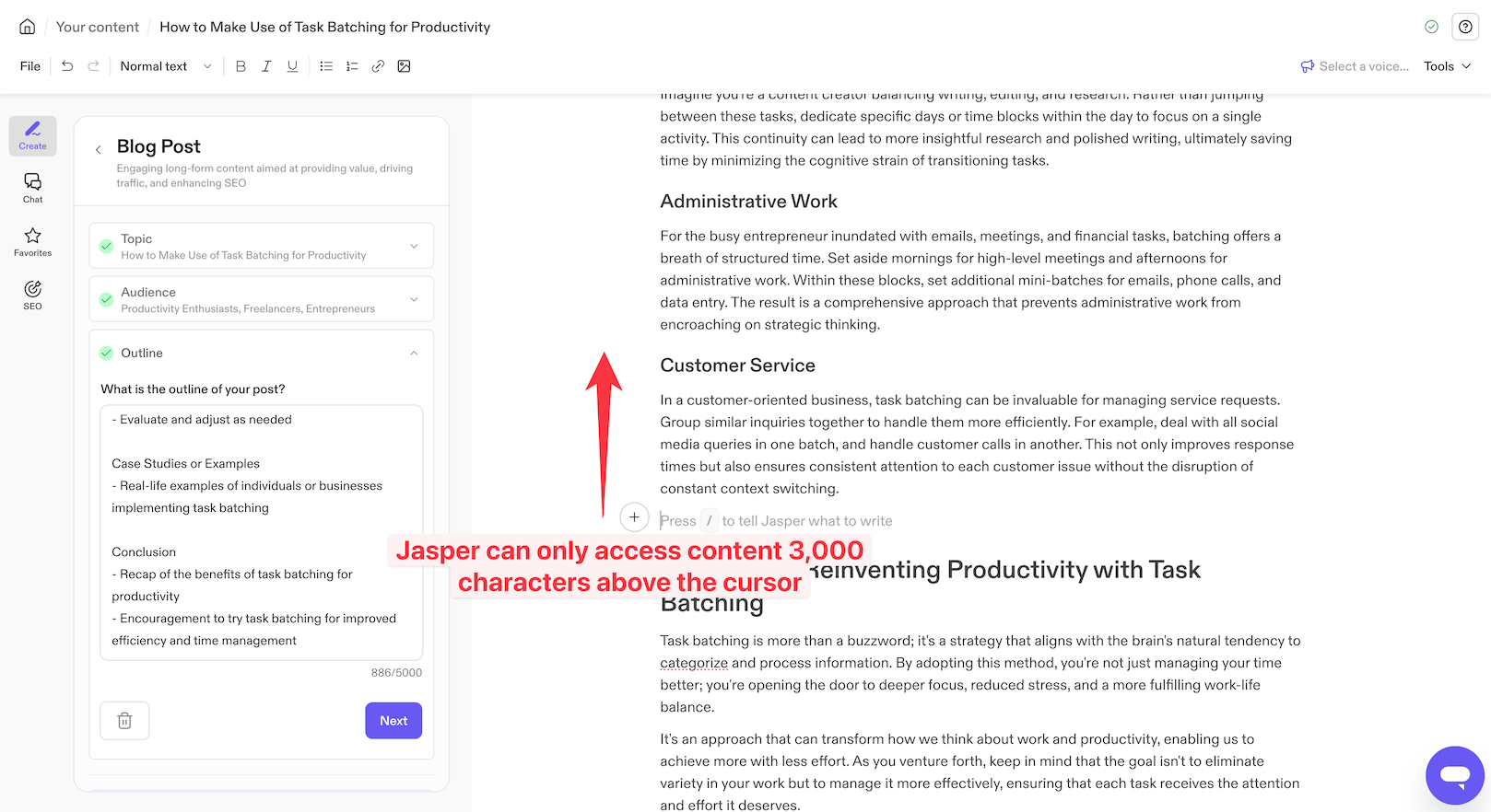 - Limited context reading: Jasper can only read 3,000 characters of context in a document. This can be a challenge when working on longer documents as it may forget earlier content. However, their business plans offer 10,000 characters of context reading capability.