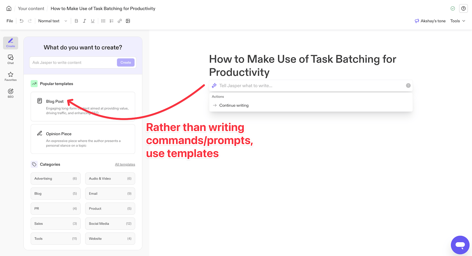 Jasper provides templates to help you create your content in a modular way.