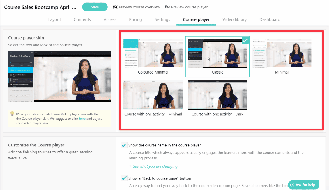 And when it comes to the course player, there are 5 different skins you can choose from.