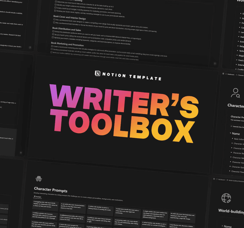 This Notion Template is a fiction writer’s dream tool to have. Let your creative juices flow with prompts tailored for characters, settings, dialogues, plots, and genres. It also comes with 10+ templates for structuring your plots and characters.