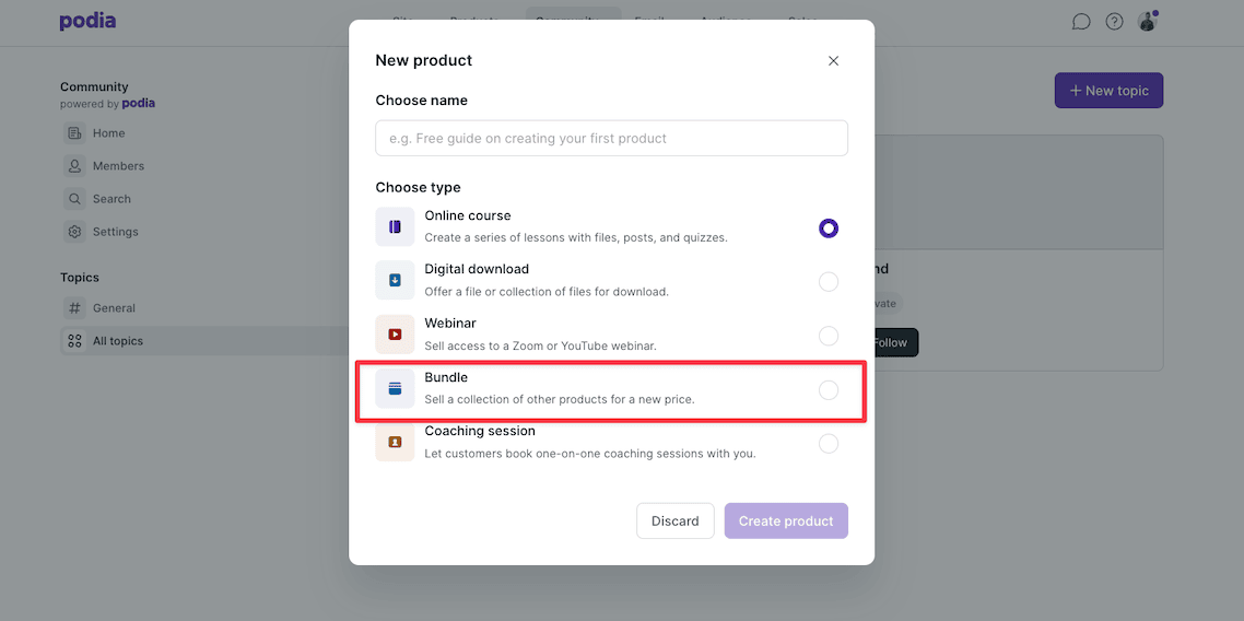Product bundles are considered as a product type in Podia.