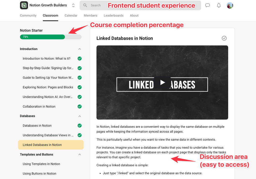 Refer to the screenshot below to see how the course (classroom) looks on the front end.