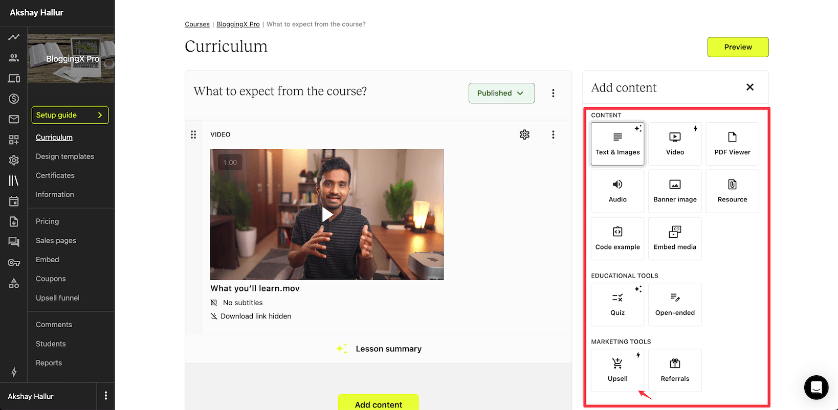 Teachable’s course creation interface is very straightforward. You have modules and lessons under them.