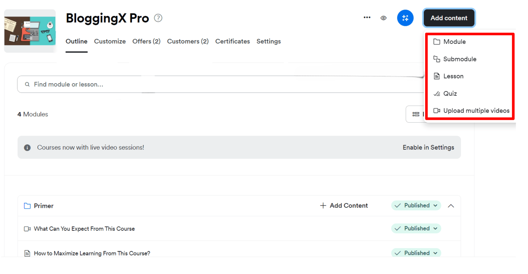 You get modules, sub-modules, and lessons.