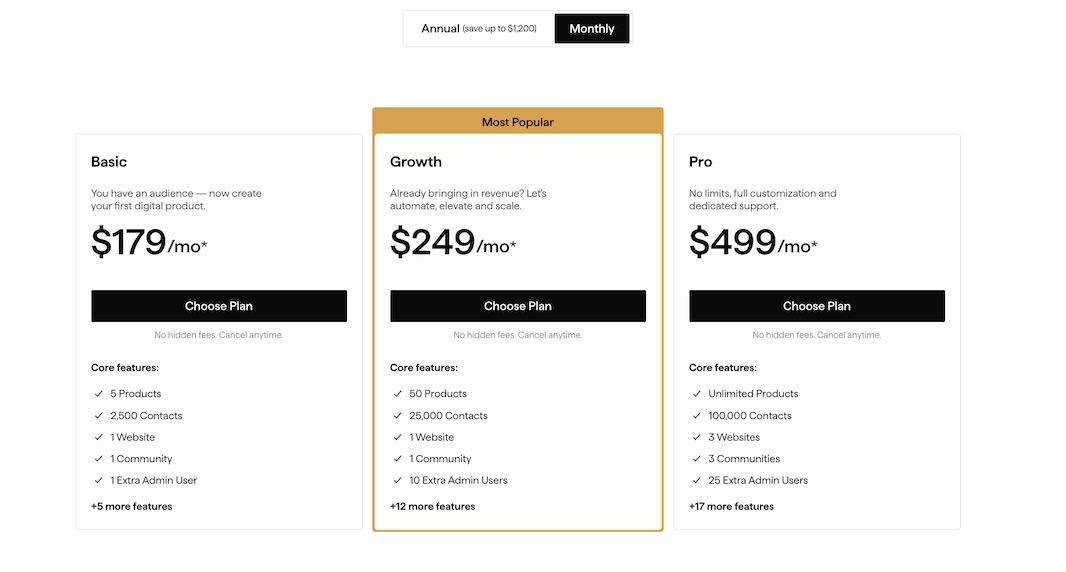 • Easier on your wallet (big upside): Teachable starts at $39/month (heads up: there’s a 7.5% transaction fee and you’re limited to 1 product). For most people $89/month with 5 product creation limit. Kajabi’s entry point is $179/month. Big difference, right?