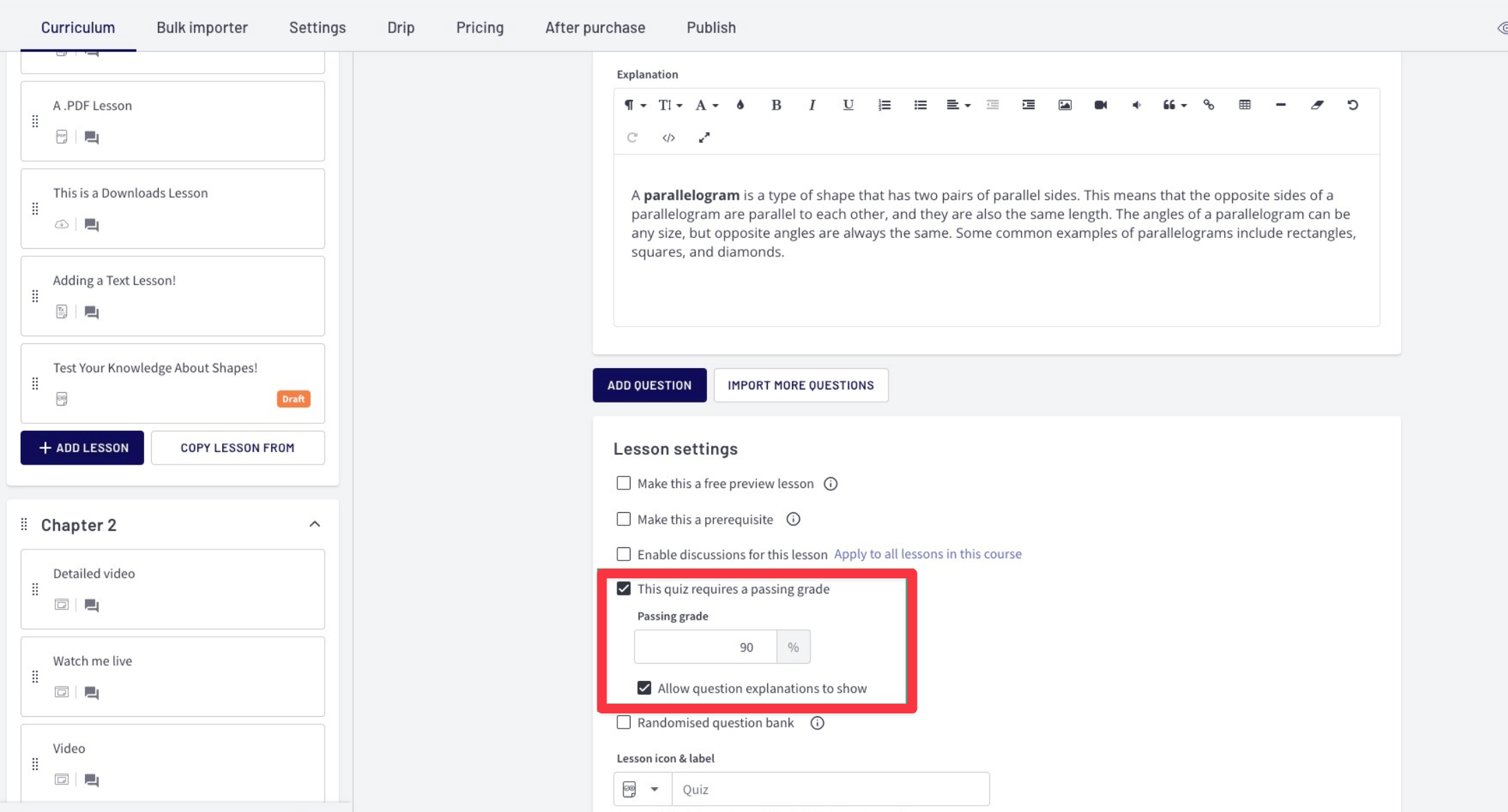 You can create video lessons, PDF lessons, text, audio, downloads, quizzes, assignments, and more.